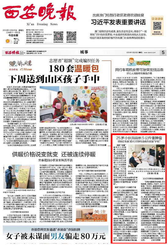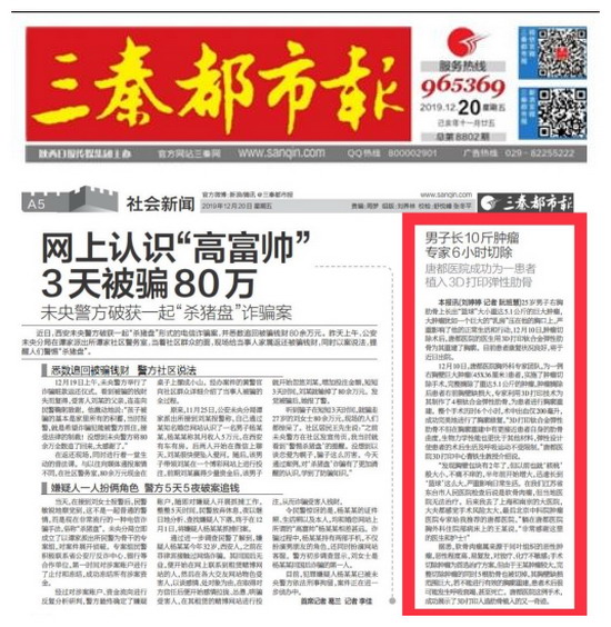央广网西安12月20日消息(记者温超)记者19日从西安唐都医院获悉,该院近日成功完成一例巨大胸壁肿瘤切除联合3D打印胸肋骨植入物胸壁重建手术。