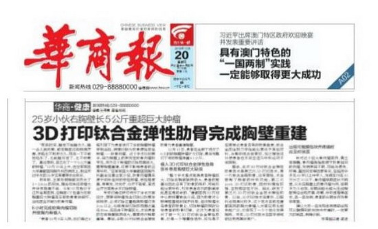 12月10日,唐都医院胸外科专家团队,为一例右胸壁巨大肿瘤(45X36厘米)患者,实施了肿瘤切除手术,完整摘除了重达5.1公斤的肿瘤,肿瘤摘除后患者右前胸壁缺损大,专家利用3D打印技术为其制作了4根钛合金弹性肋骨,为患者进行胸廓重建。整个手术历时6个小时,术中出血仅200毫升,成功完美地进行了胸廓修复。唐都医院3D打印中心曹铁生教授介绍说:“3D打印钛合金弹性肋骨不但在胸廓重建中有更接近患者自身的肋骨曲度,生物力学性能也更优于其他材料,弹性设计使患者的术后生活及呼吸运动不受限制。”