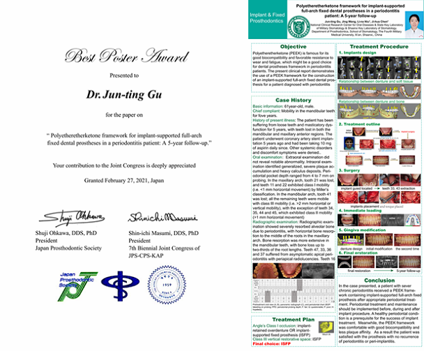 中日韩口腔修复双年会是中国、日本、韩国口腔修复学会为促进国际口腔修复学发展而设立的大会,每两年举办一次,本次由日方承办。大会共评选出4名壁报展示一等奖,其中顾俊婷博士的作品《Polyetheretherketone framework for implant-supported full-arch fixed dental prostheses in a periodontitis patient: A 5-year follow-up》,由陈吉华教授、牛丽娜教授、王菁副教授指导完成,所提供的病例,介绍了新型材料聚醚醚酮,作为义齿支架应用于牙周炎患者下颌种植固定义齿修复的过程及其5年随访后的结果,得到了同行专家的高度关注和好评。