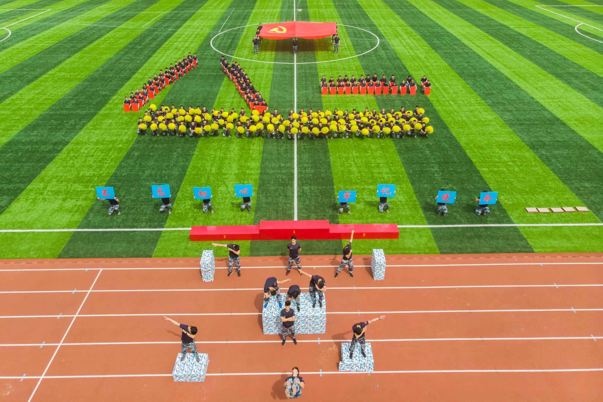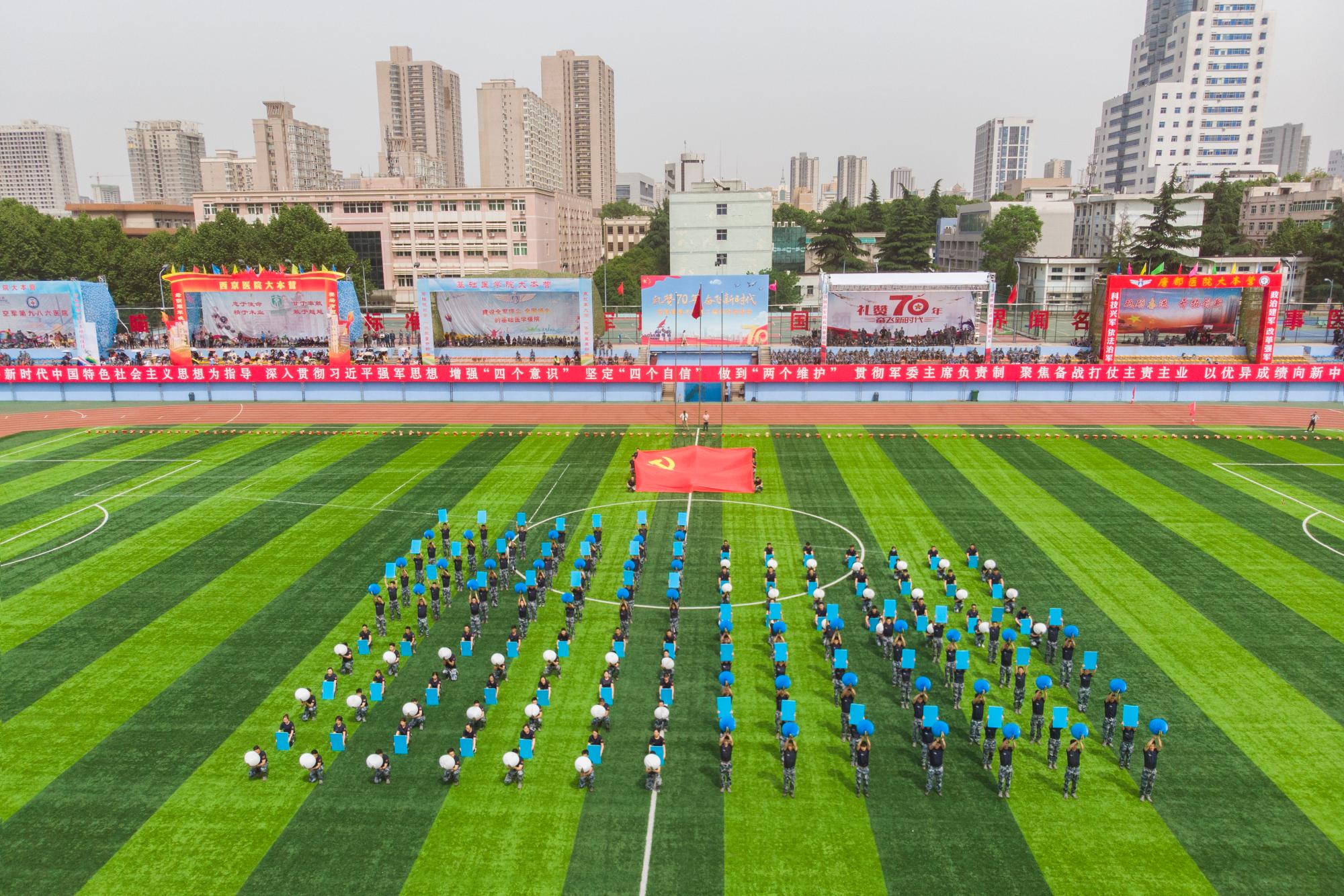 闭幕式上,还进行了精彩的团体操表演,由第一附属医院编排的《蓝天筑梦》大型团体操,主题突出、激情昂扬,充分彰显了空医大人不忘初心、牢记使命,矢志空天、筑梦蓝天的豪情风采。