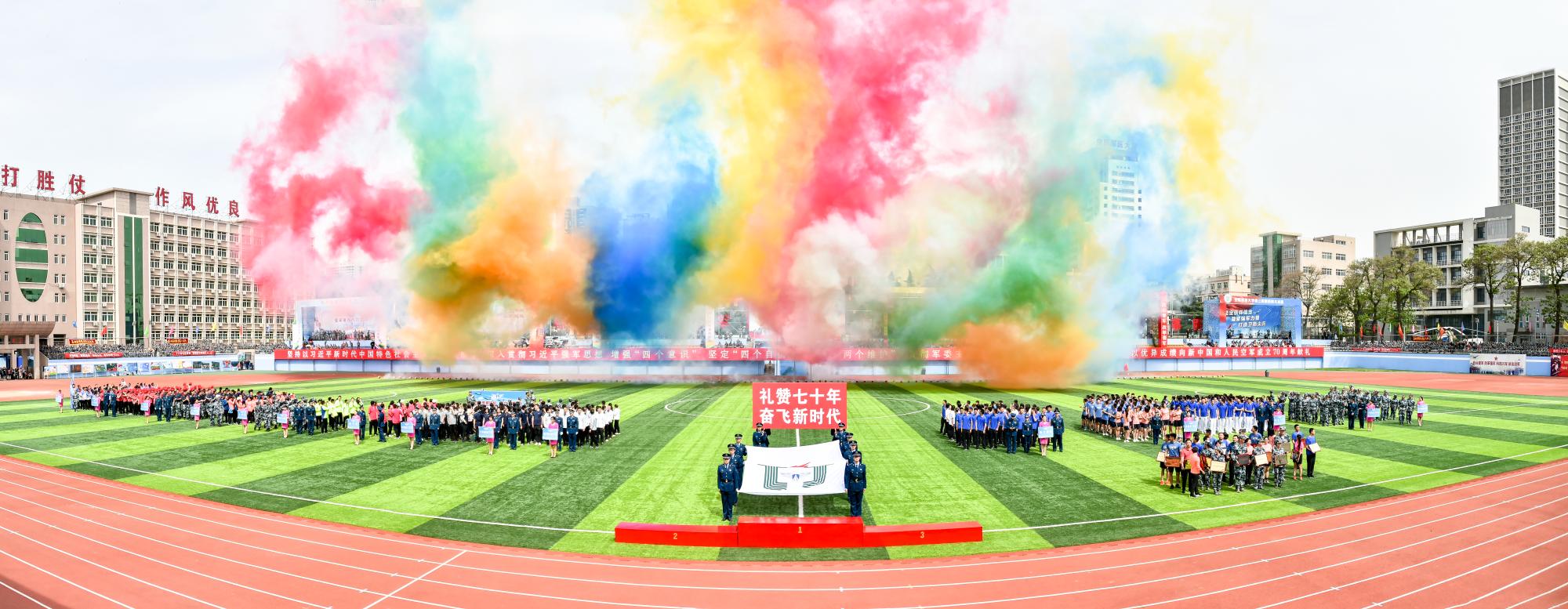 本届运动会,为新阶段学校转型发展蓄了势、鼓了劲、聚了力,广大师生员工决心在学校党委的坚强领导下,以赛场夺金的坚毅决心,舍我其谁的豪气拼劲,瞄准“百年名校”目标,同心筑梦,同力奋飞,绘就新时代强军兴校壮丽篇章,向新中国成立70周年和人民空军成立70周年献礼。