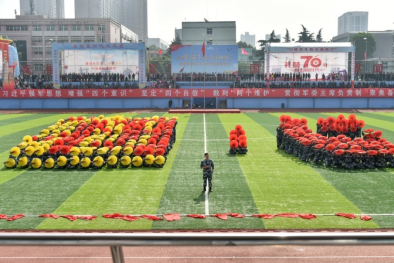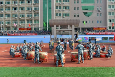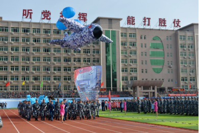 基础医学院300名学员表演的大型团体操《战斗宣言》气势恢弘,展示出军校学员的豪迈气概和军人血性。其中的男声独唱《人民空军忠于党》回荡在运动场上空,展示全体干战听党指挥、矢志强军的坚定信念和练兵备战、保障打赢的血性虎气。