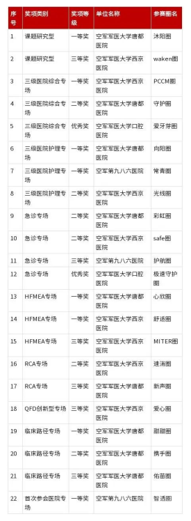 近日,第十一届全国医院品管圈(多维工具)大赛在江苏举办,来自全国各级各类医疗机构共申报圈组1224个,有866个圈进入决赛。经过激烈角逐,大学西京医院、唐都医院、口腔医院和第九八六医院分别斩获多项大奖。