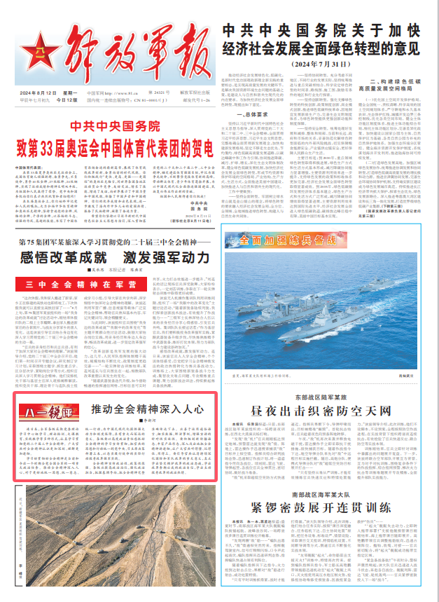 连日来,全军各级采取党委理论学习中心组学习、理论轮训、大课教育、实践教学等多种形式,认真学习贯彻党的二十届三中全会精神。广大官兵对全会精神认识更加深刻、理解更加透彻。