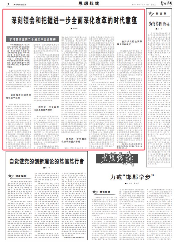 推进中国式现代化内在要求我们必须进一步全面深化改革,进一步全面深化改革必然要紧紧围绕推进中国式现代化建设。深刻领会和把握进一步全面深化改革的时代意蕴,就要深入认识和理解进一步全面深化改革的主题、重大原则、重大举措、根本保证,齐心协力抓好《决定》的贯彻落实,把进一步全面深化改革的战略部署转化为推进中国式现代化的强大力量。