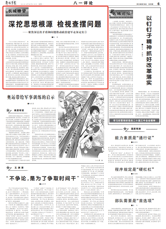 习主席在中央军委政治工作会议上深刻剖析当前政治建军需要解决的深层次矛盾和问题,强调这些问题表现在政治、思想、组织、作风、纪律等方面,根子在理想信念、党性修养、官德人品上,要求各级特别是高级干部要把自己摆进来,拿出抛开面子、揭短亮丑的勇气,以深挖根源、触动灵魂的态度,深刻反思,认真整改,解决好思想根子问题,推动政治建军走深走实。