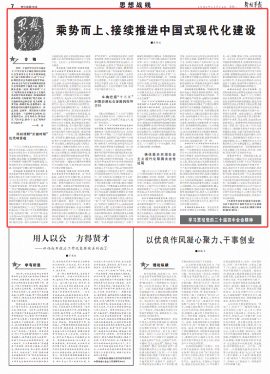 凝聚奋斗伟力。团结就是力量,奋斗成就伟业。《建议》号召全党全国各族人民团结起来为实现“十五五”规划而奋斗,强调要坚持和加强党中央集中统一领导,推进社会主义民主法治建设,促进香港、澳门长期繁荣稳定,推动两岸关系和平发展、推进祖国统一大业,推动构建人类命运共同体,充分调动全社会投身中国式现代化建设的积极性主动性创造性。前进道路上,全党全军全国各族人民要更加紧密地团结在以习近平同志为核心的党中央周围,为基本实现社会主义现代化而共同奋斗,不断开创以中国式现代化全面推进强国建设、民族复兴伟业新局面。