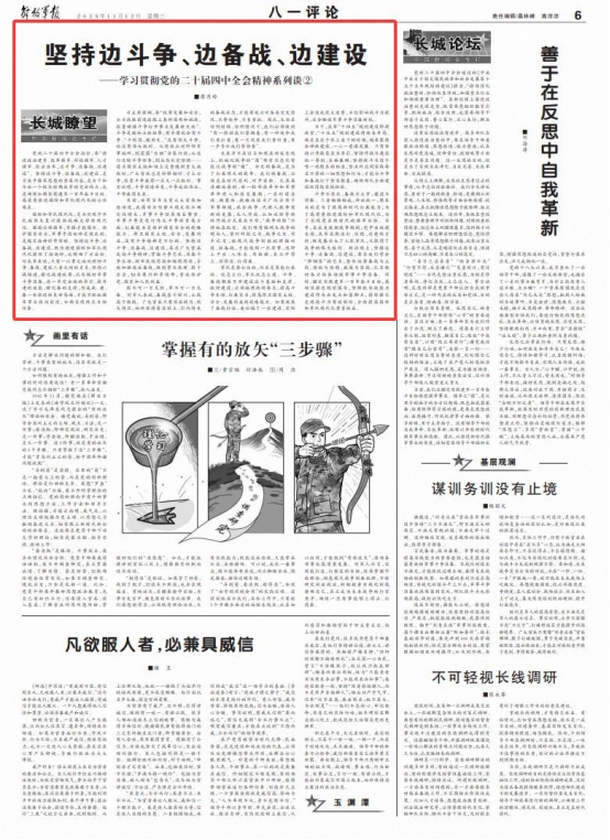党的二十届四中全会指出,要“推进政治建军、改革强军、科技强军、人才强军、依法治军,边斗争、边备战、边建设”。坚持边斗争、边备战、边建设,是习近平强军思想的重要内容,是当下和今后一个较长时期我军的突出特点,也是确保如期实现建军一百年奋斗目标、高质量推进国防和军队现代化的必然要求。