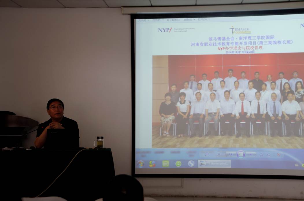 报告会上范吉钰教授结合世界先进职业教育国家职教发展经验,重点汇报了他参加河南省教育厅赴新加坡南洋理工学院“第三期院校长班培训班”的学习体会,给大家上了一堂生动精彩的职教理念报告会。