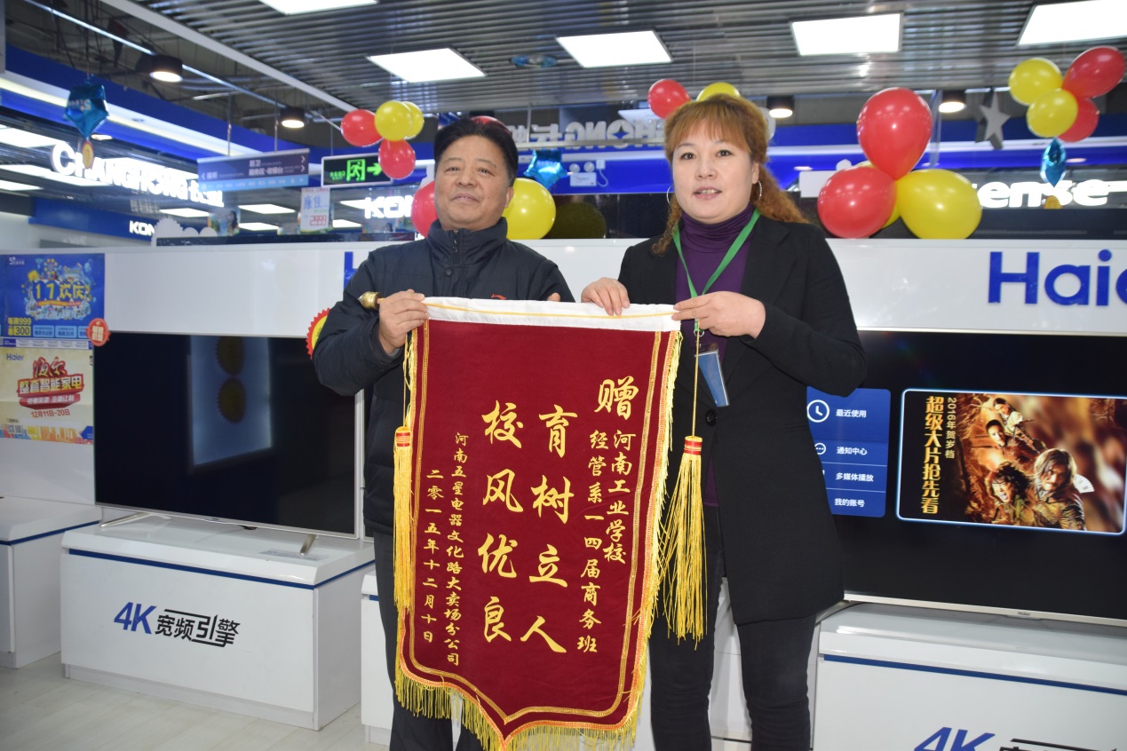 张华校长亲自到实习现场看望大家,对学生实习给予肯定并提出了学校的希望,双方达成合作,认定五星电器文化路北环店为河南省工业学校营销专业实习基地,并举行了挂牌仪式。2015年12月12日,是该专业学生校外实习的结束时间,也是让他们记忆深刻的日子。由于他们的优异表现,五星电器文化路大卖场分公司为该班级制作了“育树育人、校风优良”的锦旗,王店长表扬实习中特别突出的李澳、李明霞、张婷婷、浮晨阳、苑乾阳等5名同学并颁发奖状,最后王店长亲自送14商务班每人一份精美礼物作为纪念,同学们倍受鼓舞。
