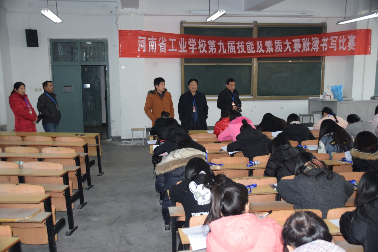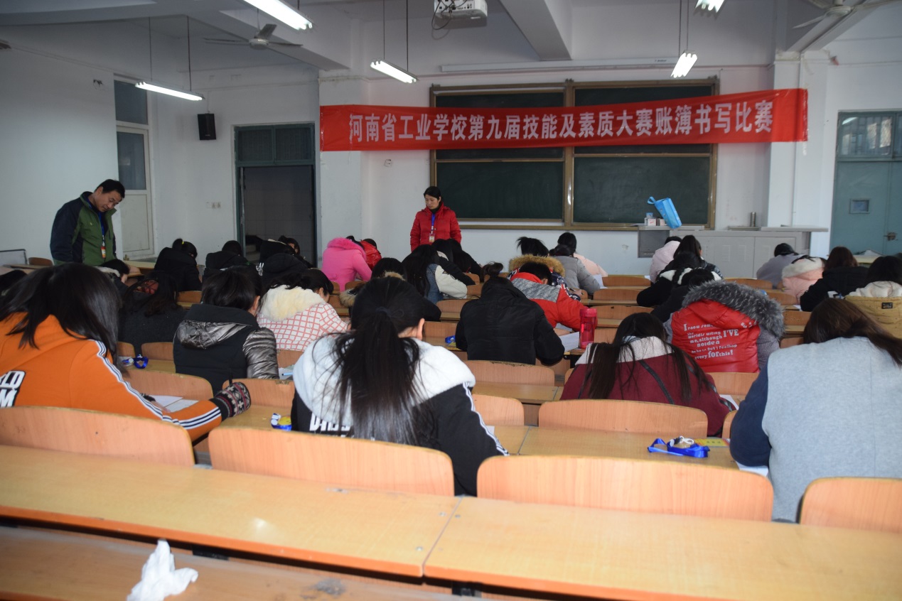 2015年12月17日下午,河南省工业学校第九届技能及素质大赛账簿书写比赛项目随着陈仁鹏老师宣布比赛开始,参赛的47名学生在教学楼108教室如期进行,经过半小时的认真书写,账簿书写比赛圆满结束。