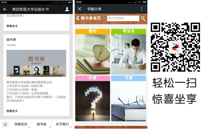 7月29日开始,通过微信购买第四军医大学出版社图书已经变成现实。“微书城”开辟了新的购书途径,能够最直接地使读者和我社进行在线交流,方便读者购买。
