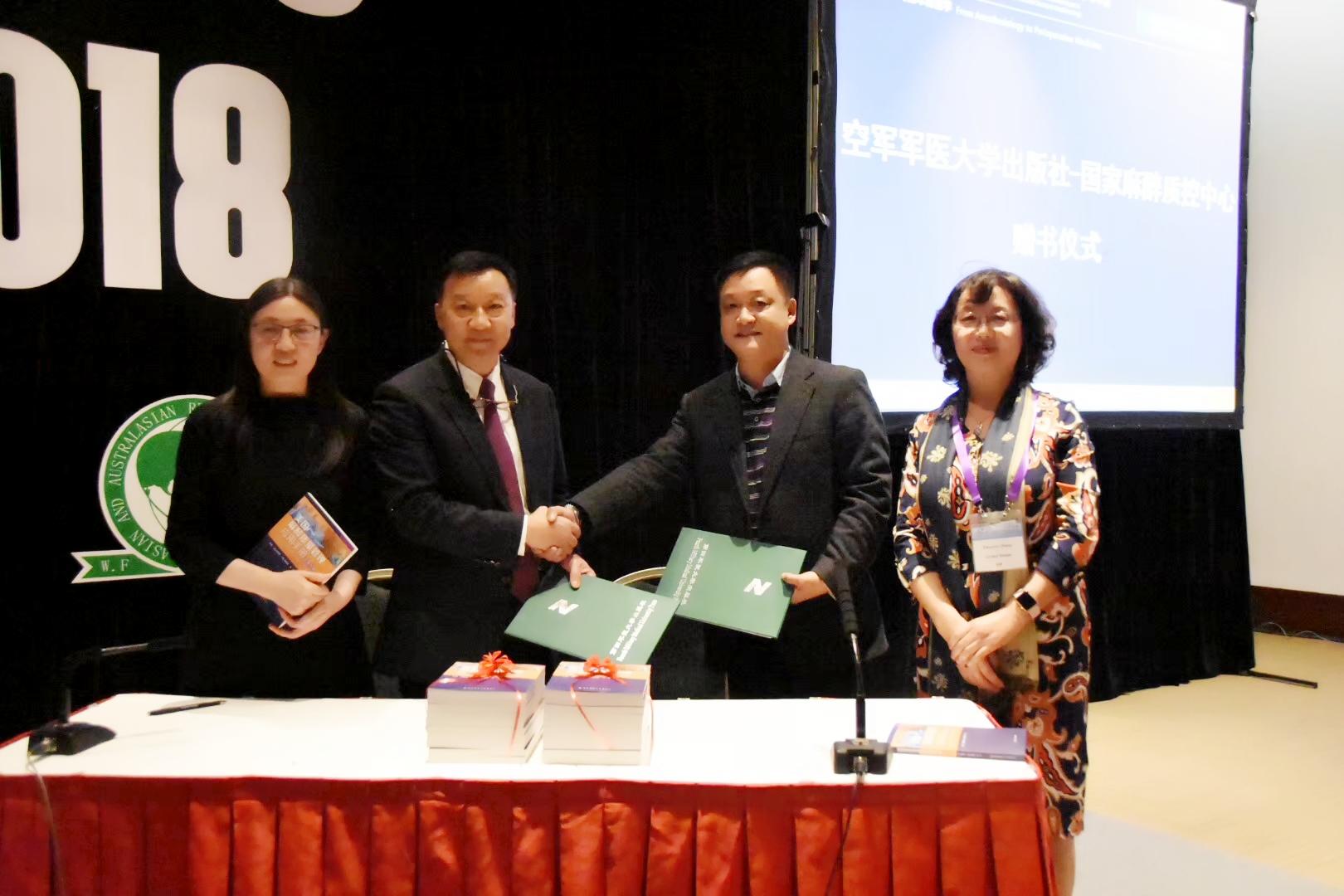 2018年11月4日,第四军医大学出版社《美国麻醉质量管理应用手册》赠书仪式在北京第15届亚奥麻醉学术年会暨中华医学会第26次全国学术麻醉年会上举行,第四军医大学出版社朱德强社长,本书主编、空军军医大学口腔医院麻醉科张惠主任,国家麻醉专业质控中心黄宇光主任等出席了赠书仪式。
