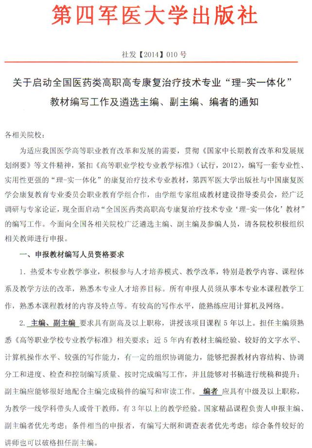 上一条:关于启动“海南版中职护理专业创新示范教材”编写工作及遴选主编、副主编、编者的通知 下一条:关于启动全国医药类高职高专药学专业“十二五”规划教材改版工作及遴选主编、副主编、编者的通知
