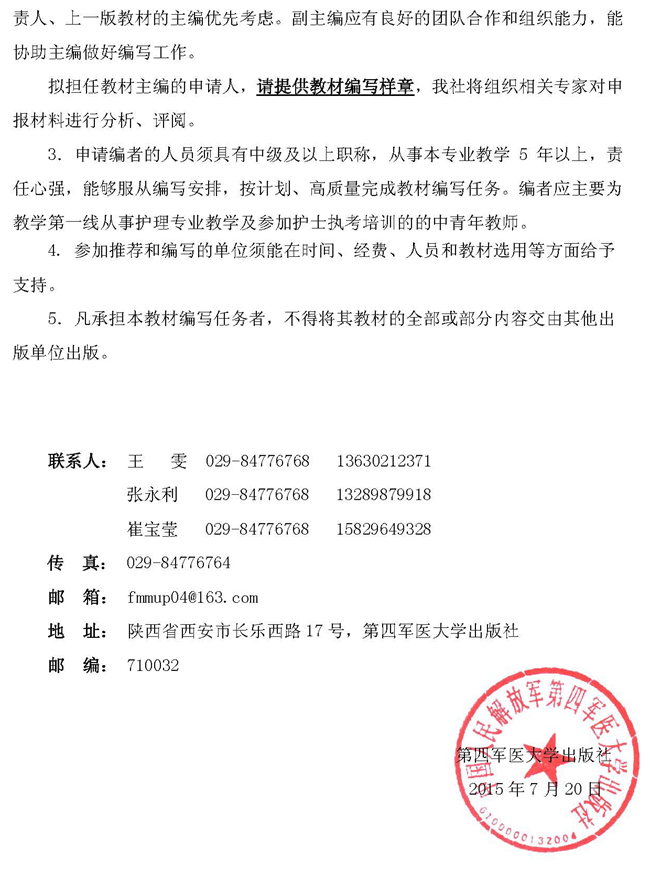 上一条:关于遴选全国医药类高职高专护理专业“十三五”规划教材主编、副主编、编者的通知 下一条:关于申报“十三五”国家重点图书出版规划的通知