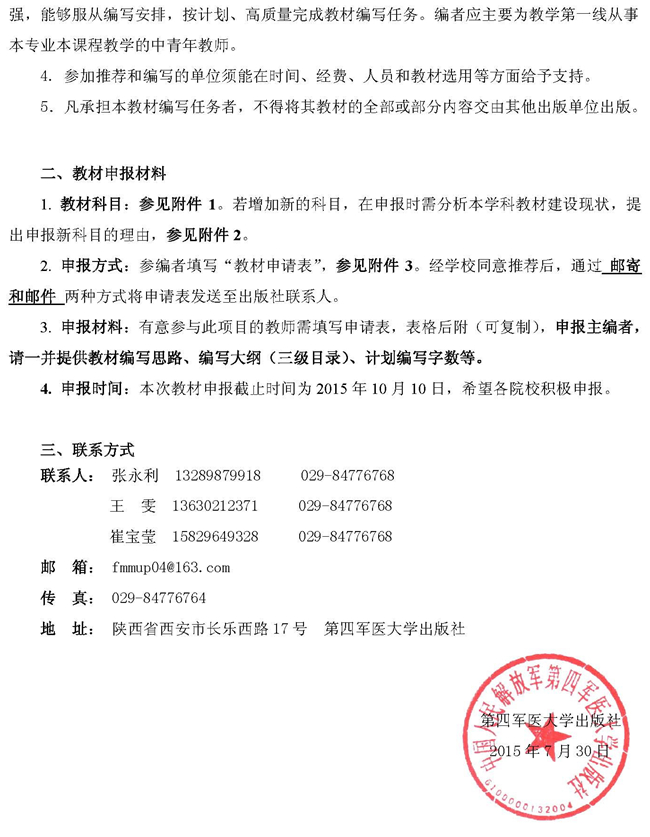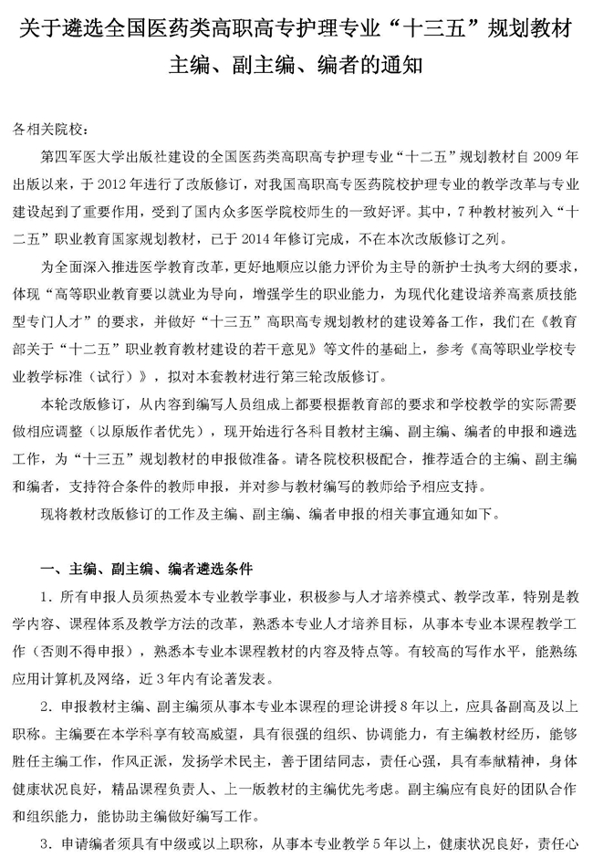 上一条:关于启动全国医药类高职高专医学影像技术专业“理实一体化”教材编写工作及遴选主编、副主编、编者的通知 下一条:《国家护士执业资格考试考点精讲与综合训练》(第3版)参编邀请函
