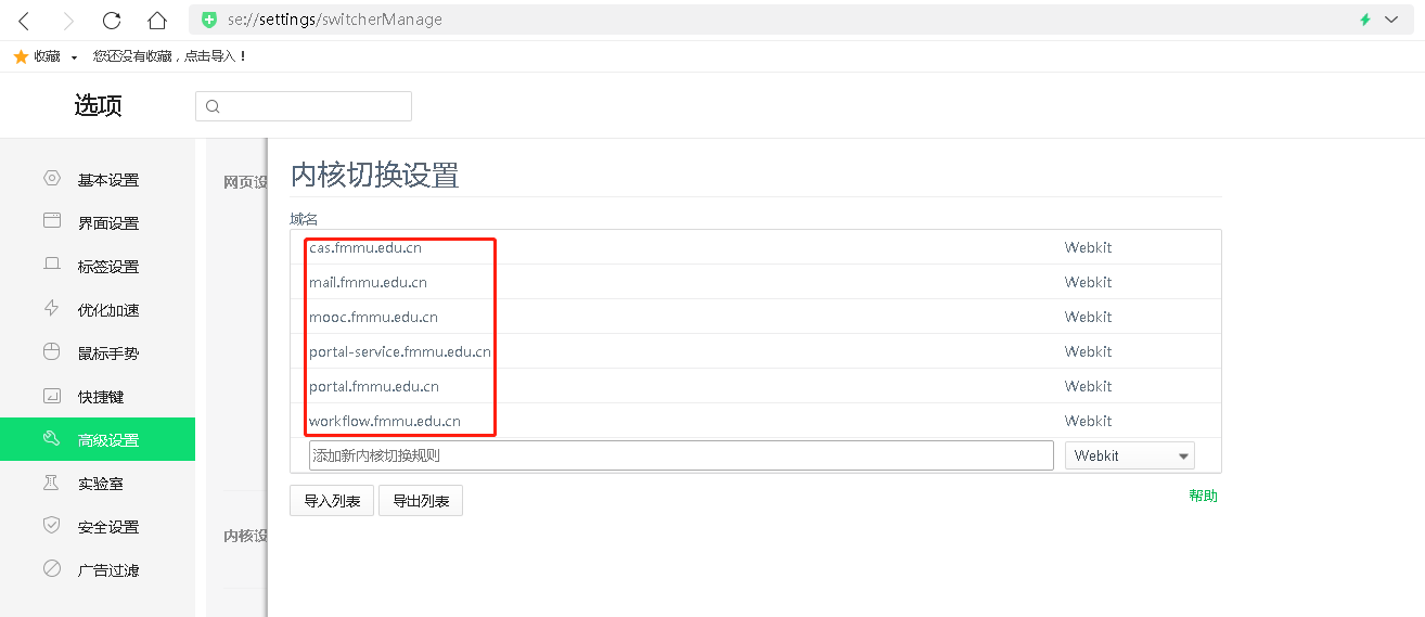 推荐您使用谷歌浏览器(Chrome)、火狐浏览器(Firefox)或Edge浏览器。使用360浏览器请设置为极速模式:可在每次域名跳转时依次将其设置为极速模式,或按下图方式在浏览器设置中将相关域名(cas.fmmu.edu.cn、portal-service.fmmu.edu.cn、portal.fmmu.edu.cn、workflow.fmmu.edu.cn)均设置为极速模式。其他使用问题请咨询776640(冯老师)。