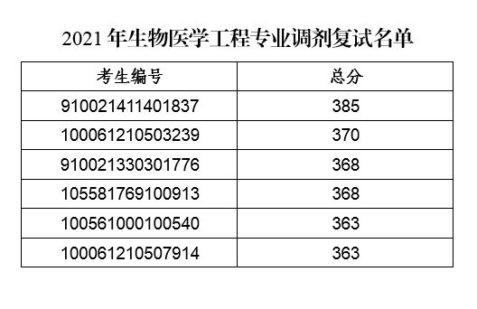 根据调剂报名情况,现将进入生物医学工程专业调剂复试名单公布。我校已通过中国研究生招生信息网调剂平台向进入复试考生发放复试通知。复试须参加资格审核、体检、心理检测、英语笔试、学科考核等环节,学科考核时间由复试院系另行通知,请保持电话畅通,复试方案详见我校官网通知。