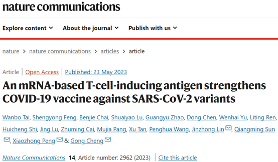 2023年5月23日,来自深圳湾实验室、清华大学、中国医学科学院医学生物学研究所及复旦大学等机构的研究团队在Nature Communications发表题为“An mRNA-based T-cell-inducing antigen strengthens COVID-19 vaccine against SARS-CoV-2 variants”的研究论文,该研究旨在通过协同激活细胞免疫和体液免疫应答,提升新冠疫苗免疫保护效果,有效应对新冠病毒突变造成的免疫逃逸。