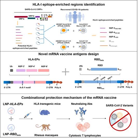 当前新冠疫苗设计主要有两点问题需要进一步解决:1、疫苗免疫后抗体消减速度较快,仅从抗体角度可能无法提供长效保护,下一代新冠疫苗如何提供更强效保护?2、新冠病毒突变速度较快,可能导致现有疫苗保护作用降低或是丧失,新一代疫苗如何有效避免突变株免疫逃逸?针对以上两个问题,研究人员首先系统分析新冠病毒基因组,发现在其非结构蛋白3(NSP-3), NSP-4和NSP-6中包含富集细胞免疫表位的区段,且在不同流行突变株间高度保守,并通过实验验证以上表位富集区可有效激活人体细胞免疫应答。研究人员进一步利用mRNA疫苗技术制备一种包括3种细胞免疫富集区的新型抗原HLA-EPs,可靶向激活T细胞免疫。