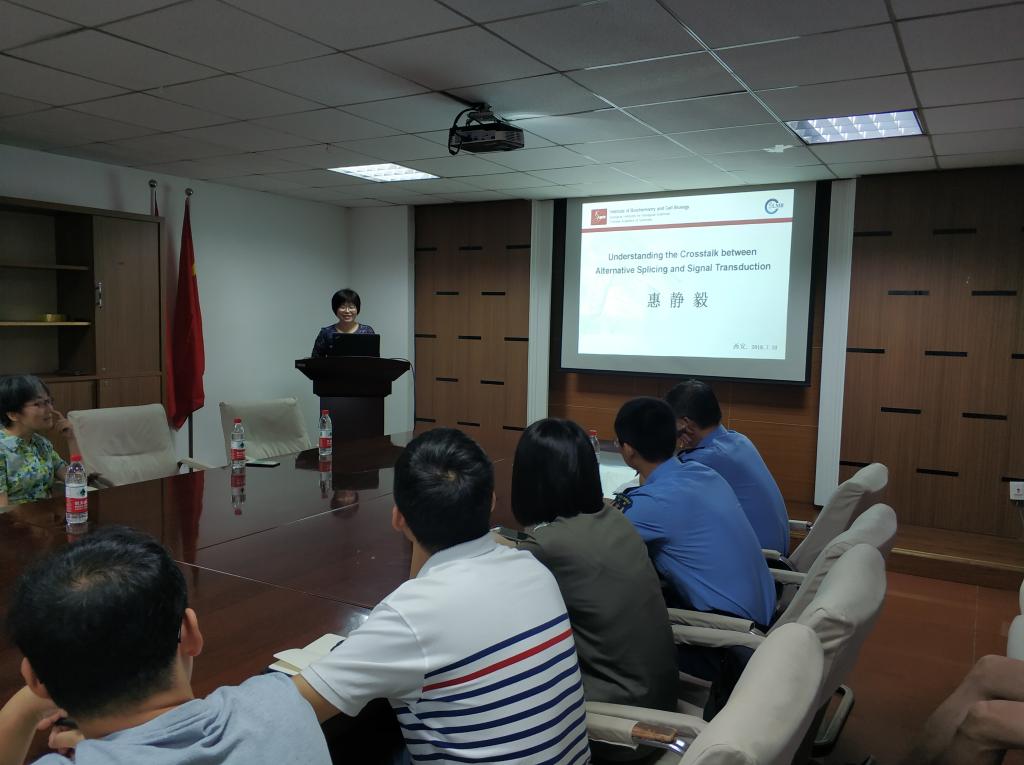 2018年7月10日,药学系生物制药教研室邀请中科院上海生化与细胞所惠静毅教授来我校进行学术交流,并做了题为“Understanding the crosstalk between alternativesplicing and signal transduction”的专题学术报告。会议由卢兹凡教授主持,药学系部分教员及研究生参加了学术会议。报告中,惠静毅教授介绍了他的研究团队近年来在选择性剪接方面的研究工作。报告结束后,惠静毅教授与大家进行了热烈的讨论,双方建立了良好的合作意向。
