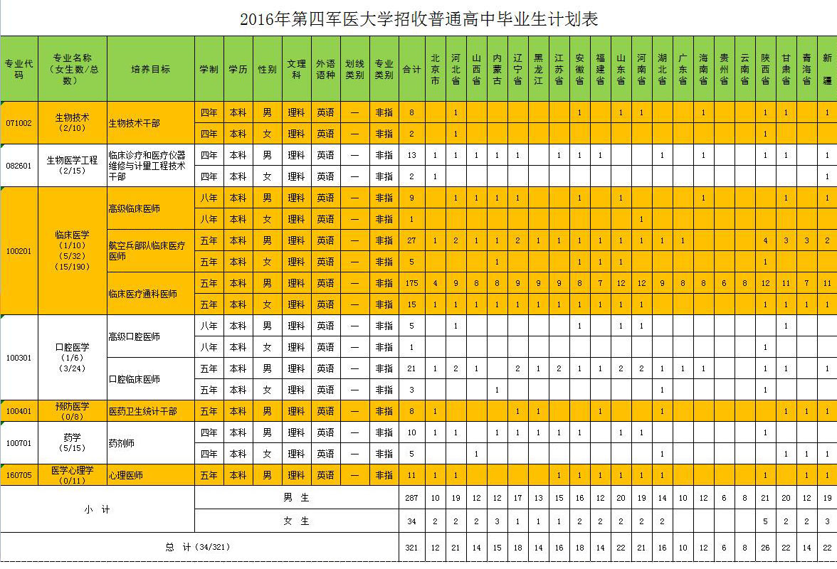 2016年第四军医大学招收普通高中毕业生计划表